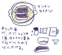 「豚バラとショウガの炊き込みごはん」 ショウガ、シメジ、豚バラ肉を細切りしたものを洗った米と分量の水の中に入れ、しょうゆ・みりん、塩を加えて炊く。 |